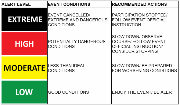 A color-coded Event Alert System (EAS) will communicate the status of course conditions to participants leading up to and on race day. The levels range from Low (green) to Moderate (yellow) to High (red) to Extreme (black) based primarily on the weather, as well as other conditions.